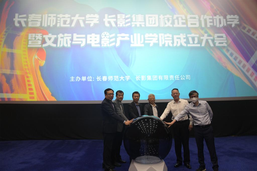 王兆海、杨步亭、徐海阳、谭政、刘多、庄严等共同按下beat365体育官网平台与长影集团校企合作办学暨文旅与电影产业学院成立启动键。